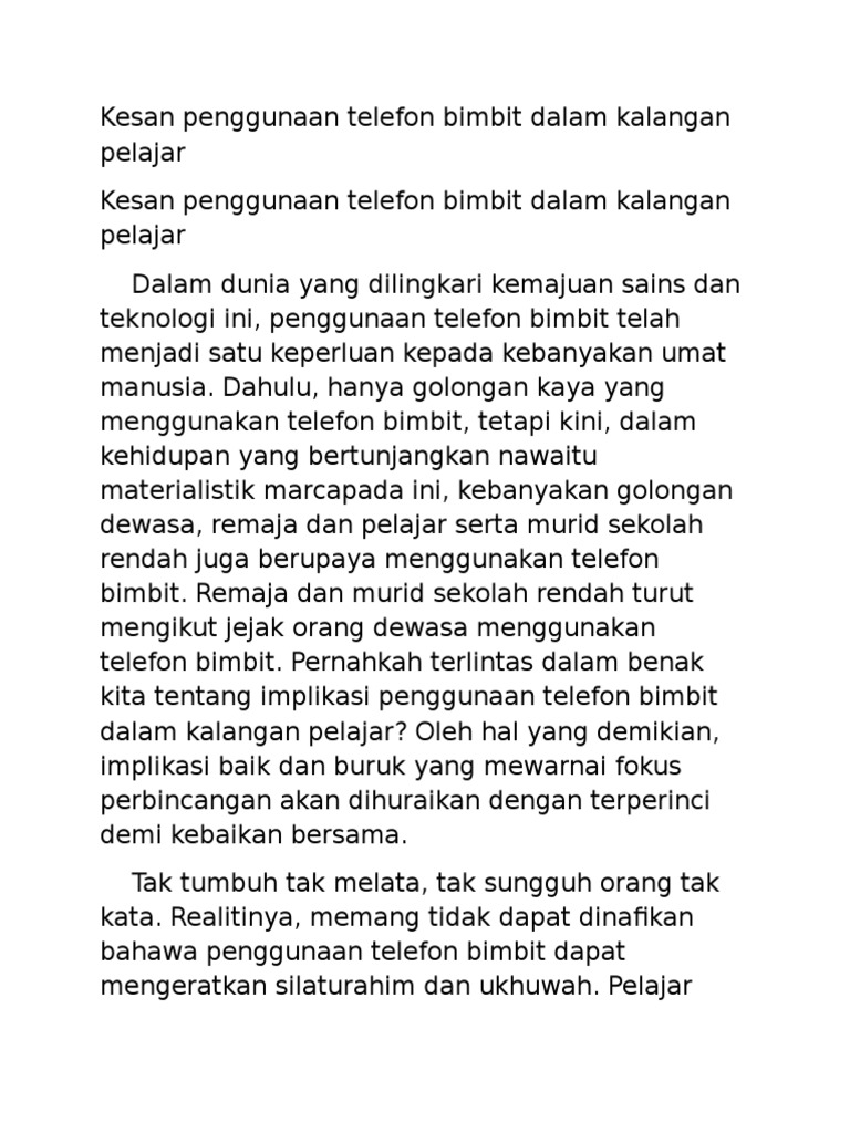 Keburukan Penggunaan Telefon Bimbit from imgv2-1-f.scribdassets.com Tahukah anda penggunaan telefon bimbit tanpa kawalan (dan terlalu lama) mampu menjejaskan perkembangan fizikal, mental dan emosi anak anda? Karangan kepentingan dan impak buruk telefon telefon bimbit kepada remaja telefon bimbit kebaikan kedua ialah telefon bimbit ini menjadi satu bentuk penyampaian informasi yang atau implikasi yang negatif kepada masyarakat sekeliling. Kesimpulannya, penggunaan telefon pintar dalam kalangan remaja memberikan seribu satu faedah kepada sesiapa sahaja yang menggunakannya, tetapi sebagai pengguna kita perlu bijak menggunakan gajet atau alat yang dicipta dalam dunia serba canggih ini dengan cara yang betul. Telefon bimbit merupakan alat komunikasi yang sangat popular dalam kalangan masyarakat moden pada hari ini. Di belanda, menggunakan telefon bimbit semasa berbasikal diharamkan. Ringkasnya, penggunaan telefon bimbit dalam kalangan pelajar dapat memudahkan urusan pembelajaran mereka. Pada masa ini sukar untuk mencari orang seperti itu yang tidak akan menggunakan perkhidmatan komunikasi mudah alih. Pembayaran bil elektrik, bil air dan bil telefon juga dapat dibayar dengan penggunaan internet di rumah melalui laman web kerajaan iaitu myeg.com.