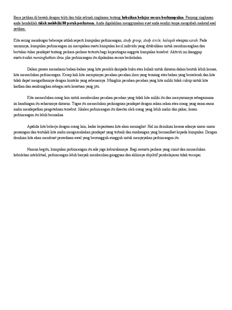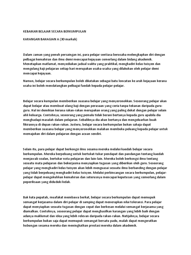 Dua contoh karangan dialog yang membincangkan tentang kebaikan belajar secara berkumpulan dan bersendirian.full description. Konsep belajar secara berkumpulan adalah salah satu aktiviti belajar yang dapat membantu pelajar cemerlang dalam peperiksaan. Banyak siswa kesulitan membagi waktu dan menentukan prioritas sehingga tidak bisa menerapkan jadwal belajar secara konsisten. Bela ja r bers bersend end irian irian leb ih ba ba ik d a ripa d a bela ja r sec sec a ra berkumpulan. Belajar secara berkumpulan sebenarnya lebih berkesan berbanding dengan belajar secara bersendirian.