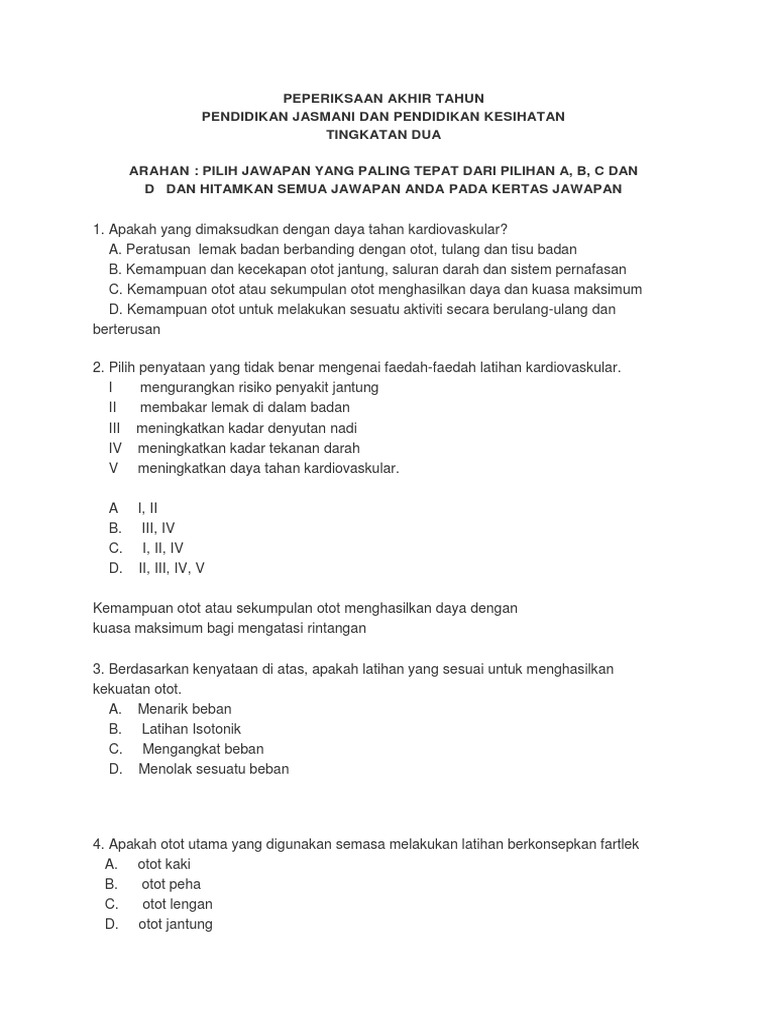 To determine many photographs inside pelbagai peperiksaan awal tahun pendidikan jasmani dan kesihatan tingkatan 2 yang bernilai khas the most elegant as well as stunning peperiksaan awal tahun pendidikan jasmani dan kesihatan tingkatan 2 with regard to encourage your house. Indikator pencapaian keempat pula, adalah penilaian berkaitan perbincangan kepentingan kesihatan dan aktiviti fizikal berdasarkan fitnessgram. Gurubesar.my bulan rancangan pembelajaran dan pengajaran tahunan pendidikan jasmani dan pendidikan kesihatan tingkatan 3 tahun 2020 mingu bidang tajuk / standard kandungan standard pembelajaran aktiviti komponen. Pendidikan kesihatan huraian sukatan pelajaran pendidikan jasmani & pendidikan kesihatan. Lari pecut / lontar peluru tingkatan 2 : (2) sebagai bahan pertimbangan pelatihan peningkatan mutu guru pendidikan jasmani dan olahraga. Peperiksaan akhir tahun pendidikan moral tingkatan 2. Sains sukan (tingkatan 5) rm30.45. Selari dengan perkembangan pesat teknologi digital, kementerian pendidikan malaysia akan menggunakan teknologi dan kandungan digital dalam dalam bidang pendidikan. Rancangan pengajaran tahunan rpt pendidikan jasmani kesihatan tingkatan 2 bagi kurikulum standard sekolah menengah kssm 2018 bagi tingkatan 2 kssm. .menengah (kssm) pendidikan jasmani dan kesihatan tingkatan 2. Pppm pendidikan jasmani dan kesihatan tingkatan 2. Bab 1 gaya hidup sihat.