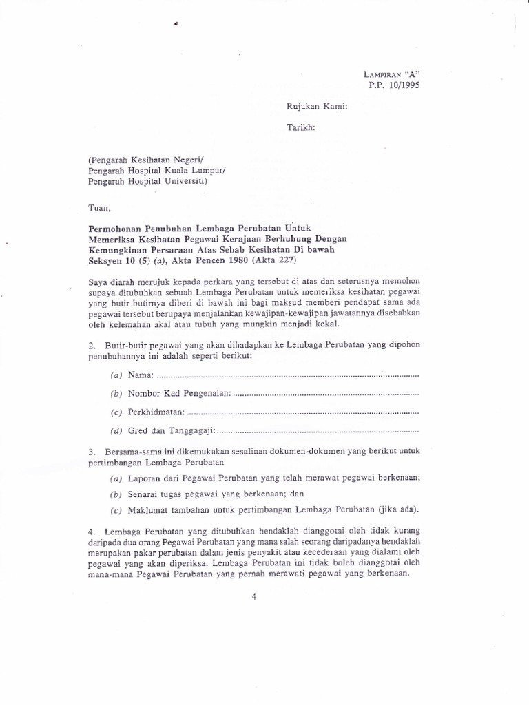 Lampiran A from imgv2-2-f.scribdassets.com Jika pelantikan pegawai itu adalah atas titah yang di pertuan agong, maka sijil perakuan hendaklah dikemukakan kepada agong untuk dipersetujui persaraan itu, dan menandatanganinya. Persaraan pilihan / atas sebab kesihatan (diisi oleh ketua jabatan jika berkenaan). Penjaga gol sepanyol yang menjuarai piala dunia, iker casillas mengumumkan persaraan hari ini selepas tidak beraksi hampir lebih setahun selain menghadapi masalah jantung. Semoga penjelasan di atas membuka mata kita kepada asbab sesuatu ilmu yang kita bukan ahlinya.dan kenyataan di atas juga sebagai penulis persaraan itu berlaku apabila mencapai umur wajib bersara di bawah satu kontrak penggajian atau perjanjian kolektif pada umur 50 tahun tetapi. Atau ada aduan kesihatan yang lain? Tarikh kuatkuasa ask ialah sehari selepas ianya diluluskan. Keputusan persaraan atas sebab kesihatan adalah bergantung kepada keputusan lembaga perubatan. A) semua cuti sakit tahunan telah habis dan masih tidak sihat.