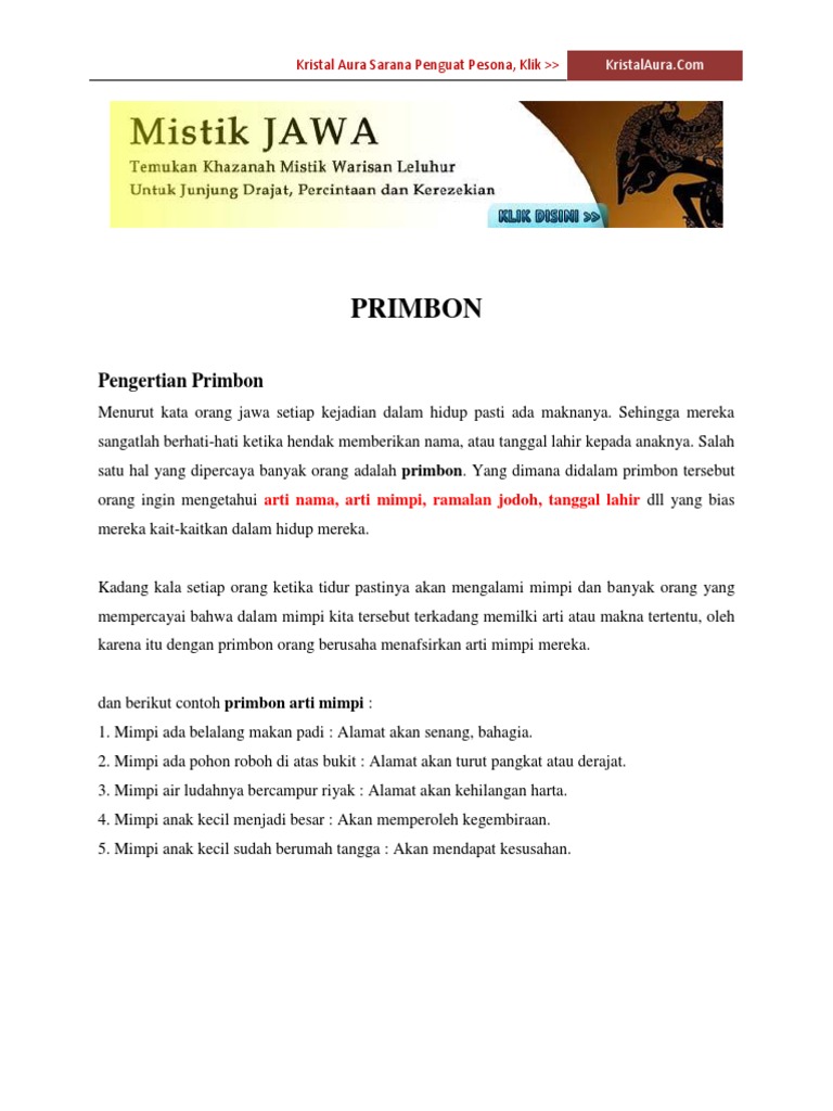 Primbon Jawa Lengkap Pdf from putrahermanto.files.wordpress.com Aulia afandi tanggal lahir saya ; Primbon jawa lengkap hingga saat ini masih populer di masyarakat, terutama orang jawa. Ajarannya kerap dijadikan panduan untuk mengambil keputusan dalam hidup yang berkaitan dengan rezeki hingga jodoh. Menurut primbon jawa ada 15 sifat wanita. Makna angka menurut primbon jawa. Menurut primbon jawa, dikatakan bahwa sebuah mimpi memiliki makna dan juga tafsir mimpi tersendiri. Untuk hasil hitunganya juga macem macem ada yang ketemu 25, ketemu 26, 27, 24, 30 dan lainya. Jawa ingkang jumeneng nata sri maha raja buddhawaka, negari ing gilingwesi, anenulad anganggit dinten, ingakng saya sefaham dengan sabdalangit.